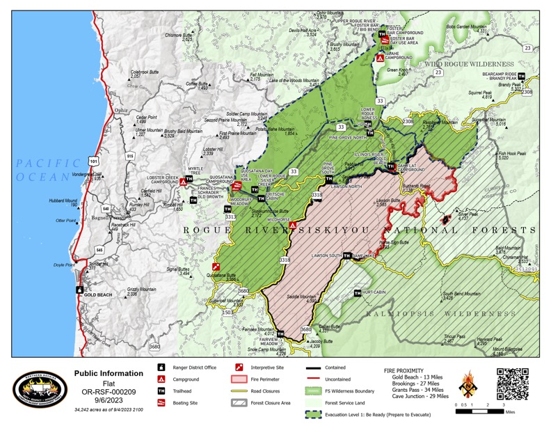Evacuations: Level 1 “Get Ready” evacuation status is in place for areas near the Flat Fire. Level 2 “Get Set“ evacuation status is in place along the Elk River from about milepost 4 to the USFS Butler Bar Campground near the Anvil Fire. Sign up for Curry Co. Everbridge Notifications (emergency alerts below to receive evacuation alerts.