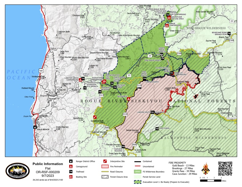 Restrictions: The Rogue River-Siskiyou National Forest is decreasing the fire danger from Extreme down to High and the Industrial Fire Precaution Level from Level 3 to Level 2, effective September 5, 2023. Public Use Restrictions (PUR) remain at Stage 3 across the forest and on the Wild Section of the Rogue National Wild and Scenic River. Visit https://bit.ly/RRSNFAlerts for more information. There is a Temporary Flight Restriction (TFR) over the fire areas. Please do not fly unmanned aircraft (drones) in the fire vicinity. If you fly, we can't.